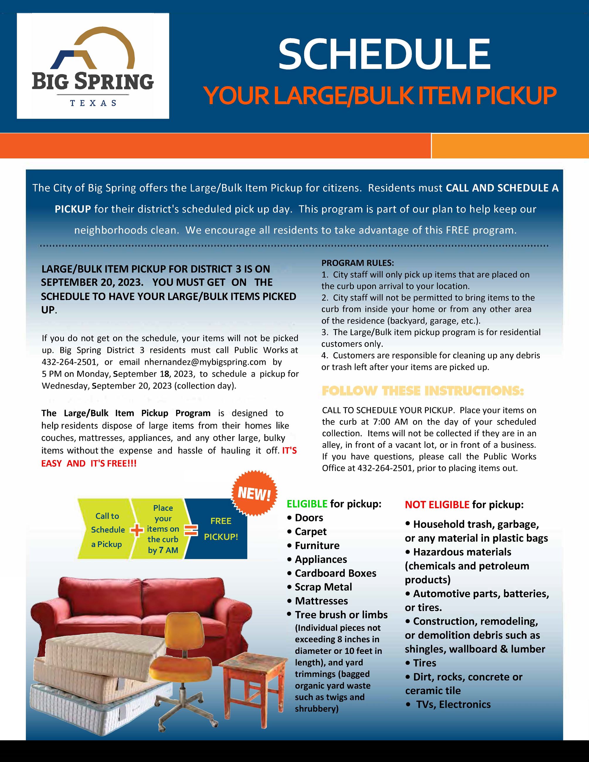 The deadline to get on the list is 5 PM on Monday, September 18, 2023. Email nhernandez@mybigspring.com to get on the Large/Bulk Item Pickup list. Get rid of old furniture or any other bulk items without the hassle and expense of hauling it off. It’s easy and it’s free!!! The City of Big Spring’s LARGE/BULK ITEM PICKUP will take place on the third Wednesday of every month in 2023, according to the dates on the schedule provided. For questions concerning Large/Bulk Item Pickup, please call the Public Works Office at 432-264-2501.