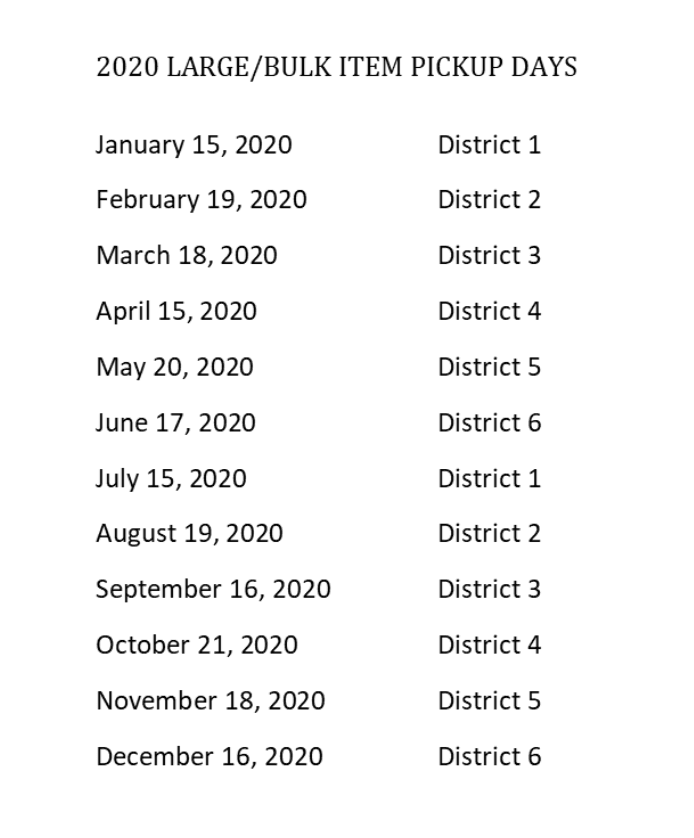 THE NEXT LARGE/BULK ITEM PICK UP WILL BE FOR DISTRICT 3 ON WEDNESDAY, SEPTEMBER 16, 2020. Residents in District 3 must call to get on the schedule for Large Item Pickup. If you are not on the schedule, your items will not be picked up.